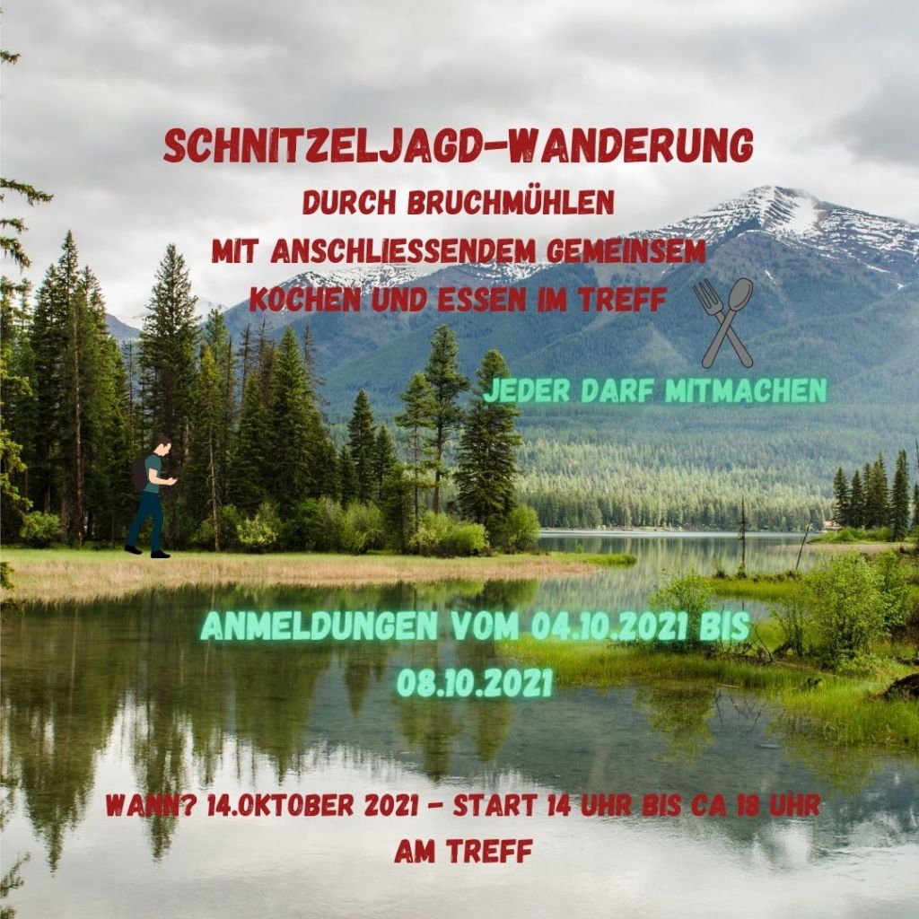 An der Aktion „Schnitzeljagd-Wanderung“ kannst du am 14.10. in der ersten Herbstferienwoche teilnehmen. Der Chefkoch Linguini braucht Unterstützung bei einer Suche in Bruchmühlen. Vielmehr hat er noch nicht verraten, aber sicher ist, dass er sich auf ein gemeinsames Essen freut. Möchtest du bei der Suche mithelfen? Jede und Jeder kann dabei sein.