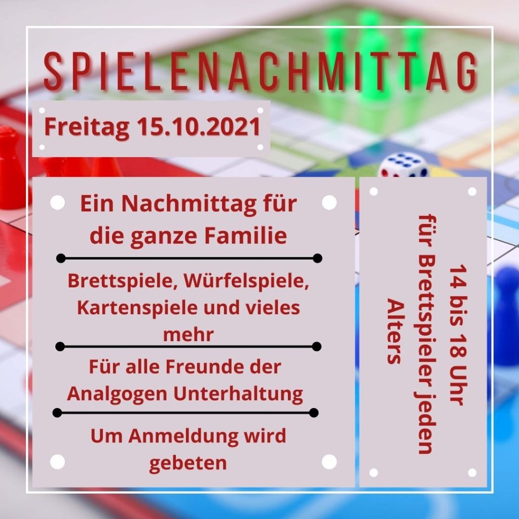 Zusätzlich bist du und deine Familie zu einem Spielenachmittag eingeladen. Am 15.10. möchte das Treff-Team gemeinsam mit dir das Gesellschaftsspielesortiment aus dem Jugendzentrum erkunden, aber vor allem auch neue Spiele ausprobieren.