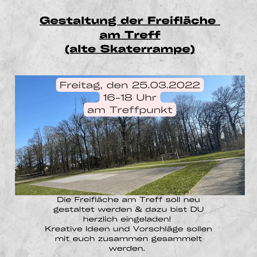 Die alte Rampe am Treff ist seit November letzten Jahres weg und nun soll dort wieder etwas Neues entstehen. Was? Das Entscheidest DU mit, wenn du möchtest. Dazu Treffen wir uns zu einem Planungsevent am Freitag den 25.03.2022 zwischen 16.00 und 18.00 Uhr. Noch sind viele Dinge möglich und eure Entscheidungen und Expertisen sind gefragt.„Gestaltung der Freifläche am Treff (alte Skaterrampe)“ weiterlesen