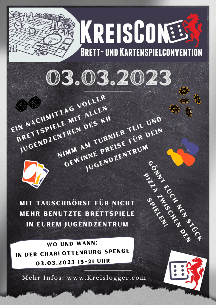 Die erste Kreiscon startet am 03.03.2023 um 15 bis 21 Uhr. Ein Nachmittag voller Brett- und Karten-Spiele erwarten euch. Für die Mutigen mit Pokerface unter euch gibt es ein Mini-Pokerturnier um Preise für euer Jugendzentrum zu erspielen. Da das ganze hungrig macht gibt es als Abendessen ne ordentliche Pizza.