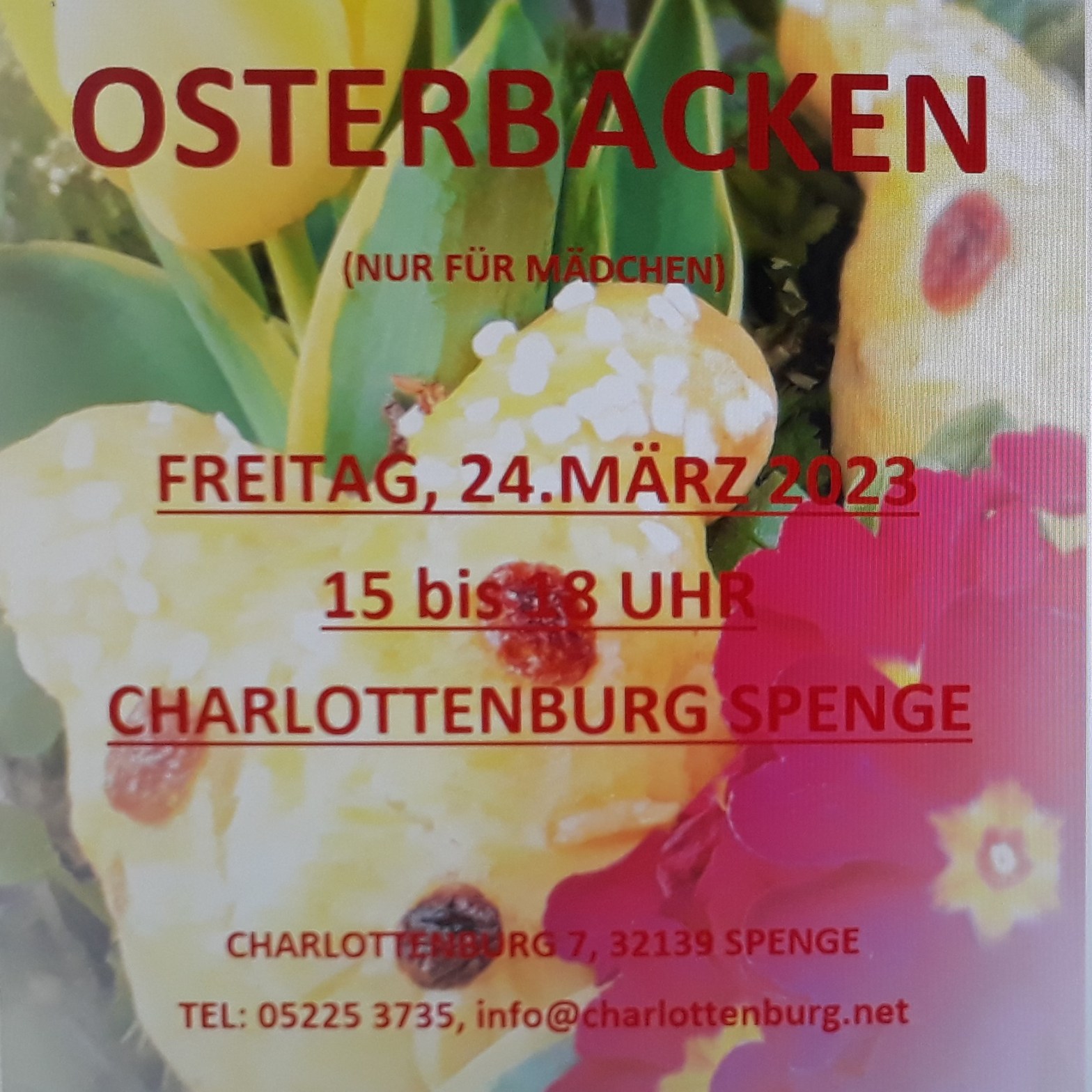 An diesem Tag öffnet die Charlottenburg für alle Mädchen ab 12 Jahren, die Lust haben auf eine Oster-Back-Aktion. Von 15 bis 18 Uhr wird zusammen gebacken.