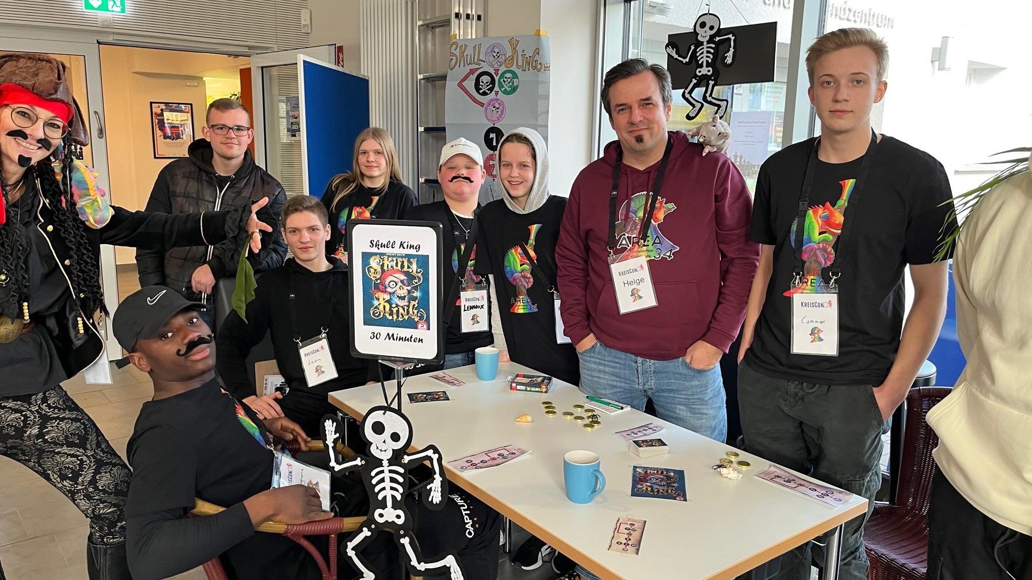 Ab dann wurde gezockt! Das Pokerturnier war natürlich der Kern des Ganzen aber da jedes Jugendzentrum seinen eigenen Spiele-Tisch anbot (plus Bilsel aber dazu später), gab es viele Spiele zum Ausprobieren: Camel Up (Vlotho), Wizzard und Alhambra (Spenge), Arschkarte (Enger), Marvel Splendor (Rödinghausen) und Skull King (Kirchlengern). Letztere Hatten einen Richtigen Messestand aufbaut und es kam durch das Piratencosplay von Erika und Ivy richtiges Spielemessefeeling auf (Challenge Accepted fürs nächste mal :P). Nicht nur die Coole deko und die beiden Piratinnen waren dabei sondern die Ganze Crew hatten kleine Piratendetails dabei (ob Schulterratte oder aufgeklebter Jack-Sparrow-Schnurrbart).