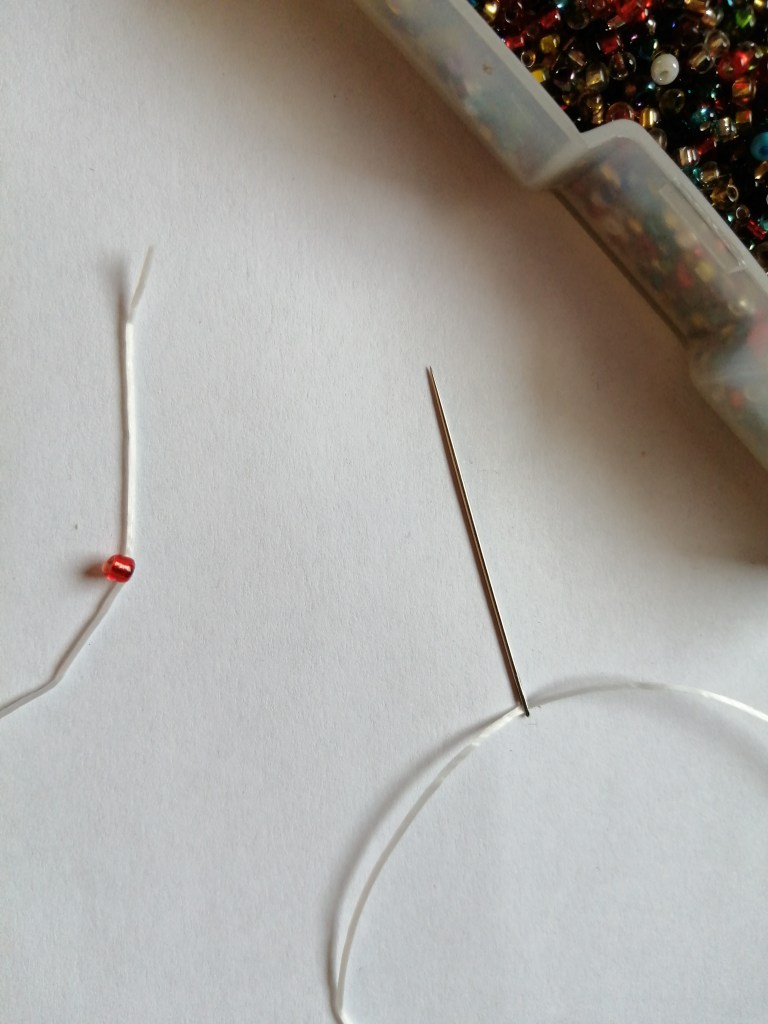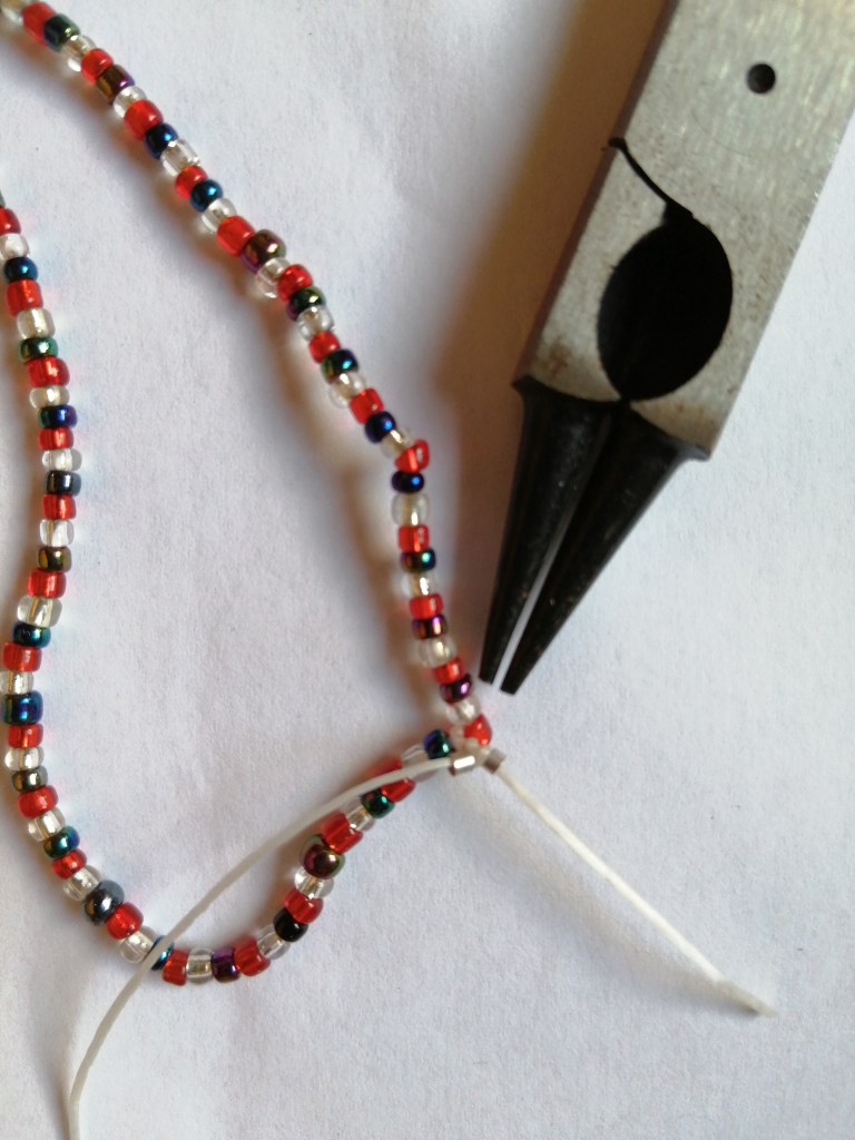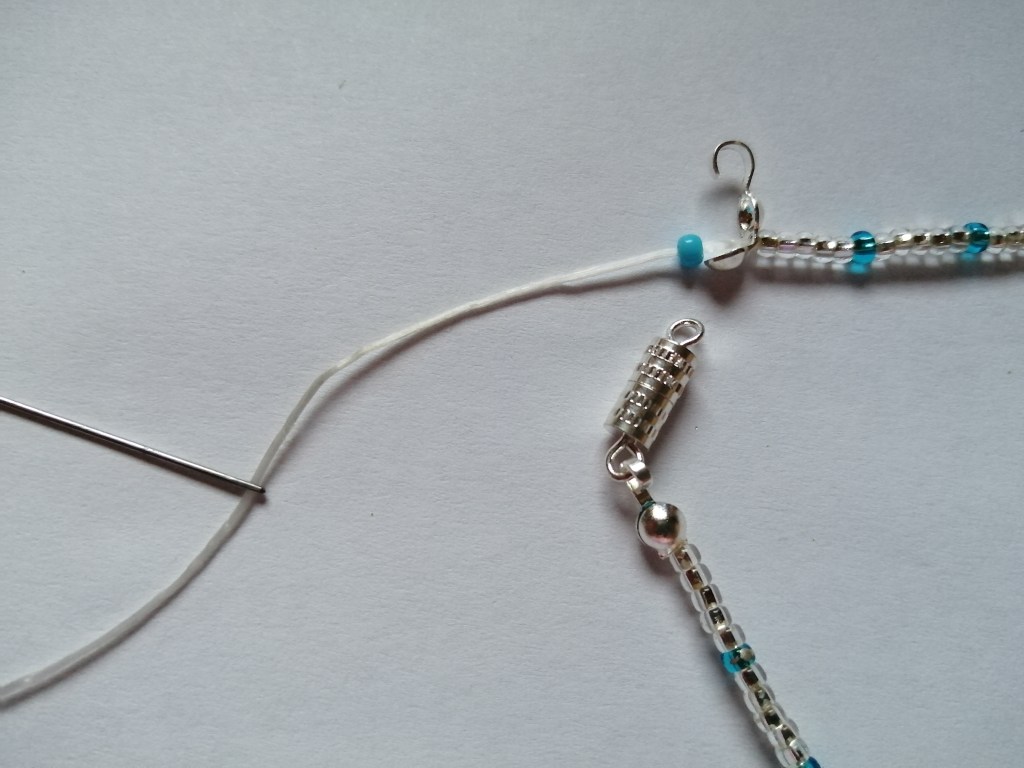 die Quetschkalotte auffädeln wie auf dem Bild, dann die Perle, die von der Kalotte eingeschlossen wird, auffädeln, nochmal mit Nadel und Faden hinter die letzte Perle und nochmal durchfädeln, noch zwei Knoten, Faden abschneiden, Quetschperle schließen und wie zu Beginn am Verschluss befestigen.