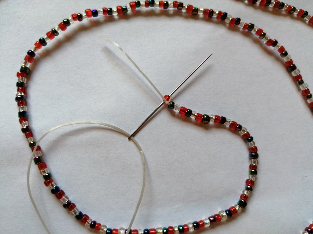 dann fädelst Du das Ende durch die erste Perle und wiederholst dies in der anderen Richtung. Jetzt Fadenende und Fadenanfang mit zwei festen Knoten verbinden.