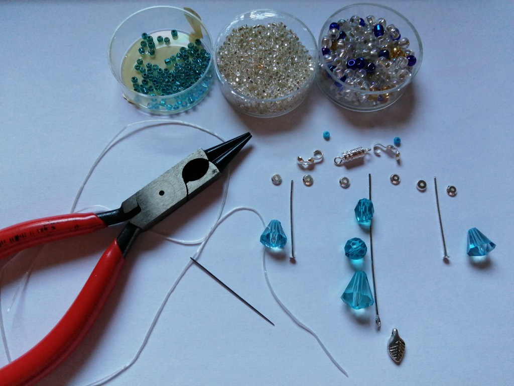 dafür brauchst Du etwas Geduld, für eine Kette benötigst Du ca. 1 Stunde. Material und Werkzeug: Nähnadel, dehnbares Fädelband, Perlen, Schmuckbiegezange, Schere. Für die einfache Kette zusätzlich Quetschperlen, für die Kolliers zusätzlich Quetschkalotten, Drahtstifte und einen Verschluss.