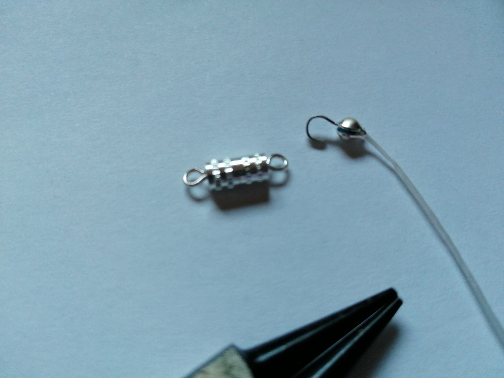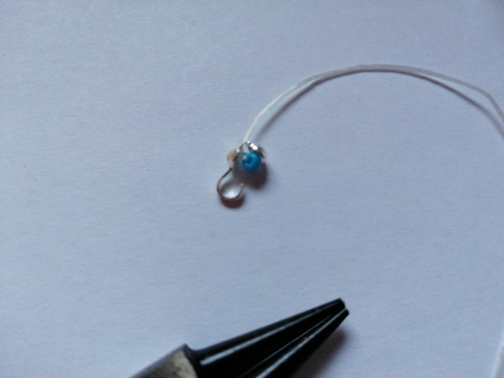 danach fädelst Du eine kleine Perle auf das Fädelband und knotest diese mit zwei Knoten fest. Nun die Quetschkalotte wie auf dem Bild auffädeln (zur Erinnerung: Draht, Verschlüsse und Quetschkalotten sind auch in goldfarben vorhanden).