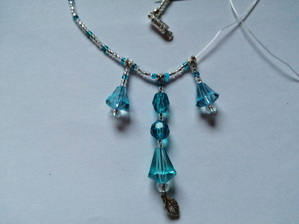 nach ca. 1,5cm weiteren Perlenauffädelns setzt Du den 2. (längeren) Anhänger zwischen 2 Scheibenperlen (das ist die Mitte), danach genausoviel Perlen fädeln wie zwischen dem 1. und 2. Anhänger, bevor du den 3. Anhänger (der genauso aussieht wie der erste) zwischen 2 Scheibenperlen anschließt. Jetzt die Kette weiter auffädeln, bis Du auf beiden Seiten der Anhänger gleich viele Perlen hast.