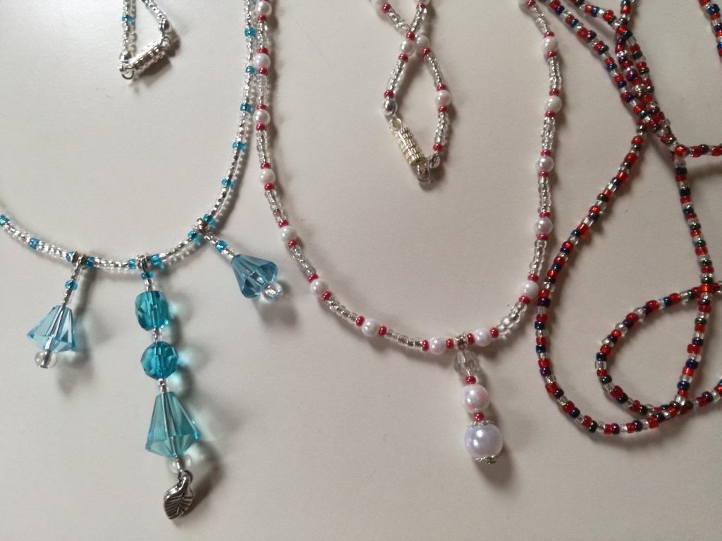 die Kolliers sind deutlich kürzer als die Kette ohne Anhänger, daher werden sie mit einem Verschluss ausgestattet. Das Kollier mit den blauen Elementen ist ca. 36cm lang, das andere ca. 44cm. Um die für Dich passende Länge zu bestimmen, fädelst Du einfach eine der größeren Perlen auf, legst Dir das Band um den Hals und ermittelst so den perfekten Sitz, indem Du anschließend nachmißt, wie lang das Band für den richtigen Sitz war. Kannst Dir dabei auch helfen lassen.