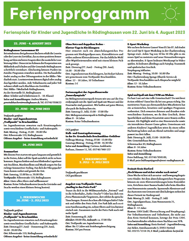 Wir freuen uns schon auf die Sommerferien mit dir. Melde dich gerne für die Aktionen bei uns an. Informationen zum Anmeldevorgang findest du auf der 2. Seite des Ferienprogramms. Auch kannst du die Öffnungszeiten des Treffs in den Sommerferien der 2. Seite entnehmen. Viel Spaß beim Durchstöbern der Aktionen. Ja, es gibt viel Text zu lesen, aber da ist bestimmt etwas dabei für dich 🙂