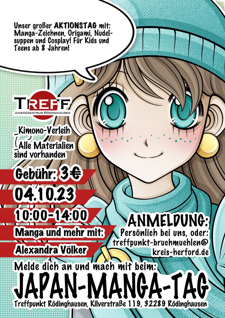 Im Jugendzentrum vor Ort findet in der 1. Herbstferienwoche ein Kreativnachmittag rund um das Thema Herbst statt. Am Japan-Manga-Tag lernst du kennen, wie du bekannte Anime Figuren zeichnest. Sei zusätzlich gespannt auf zwei Ausflüge, in die Keramikwerkstatt und in die Lasertaghalle. In der 2. Herbstferienwoche ist der Treff geöffnet von Montag bis Freitag von 15-20 Uhr. Am Montag, den 11.09. geht’s los, dann kannst du dich für die Herbstferienaktionen anmelden. Schreib uns eine E-Mail an Treffpunkt-bruchmuehlen@kreis-herford.de. Falls du Fragen hast, kannst du uns gerne ansprechen oder anschreiben. Wir freuen uns, wenn du dabei bist. Infos zu dem Japan-Manga-Tag werden noch bekannt gegeben.