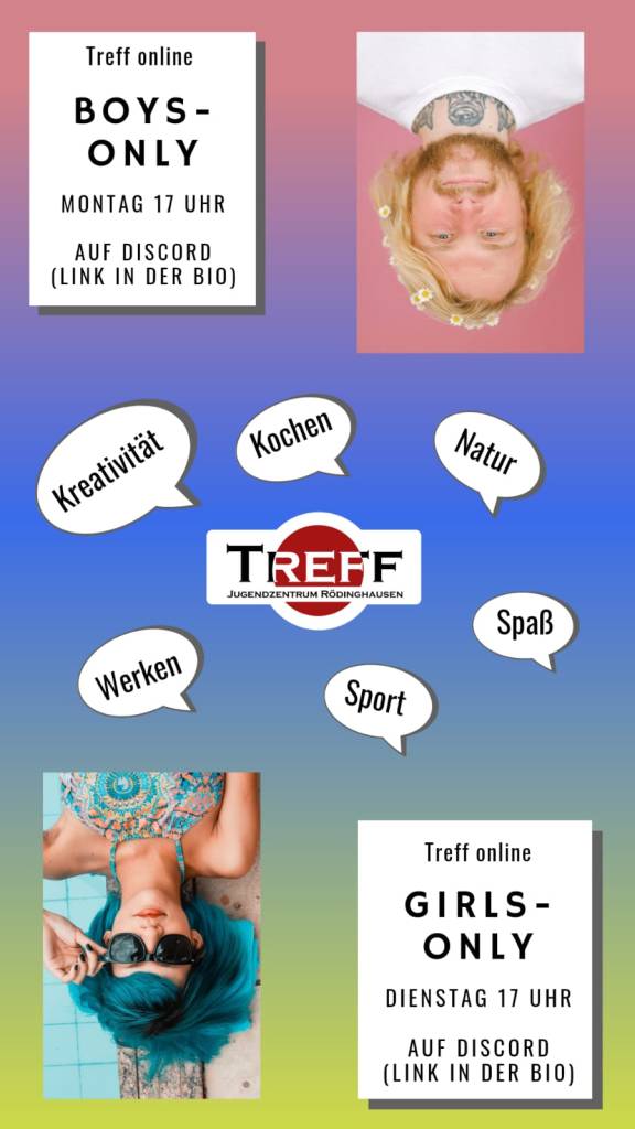 Auch bei den Treffen Boys-only und Girls-only könnt ihr mit Mario und Anneke plaudern oder/ und kreativ werden. Ihr denkt, dass online nicht viel möglich ist? Doch doch. Überlegt euch worauf ihr Lust habt und wir schauen zusammen, wie wir eure Ideen umsetzen können. Die Treffen finden auf Discord statt.
