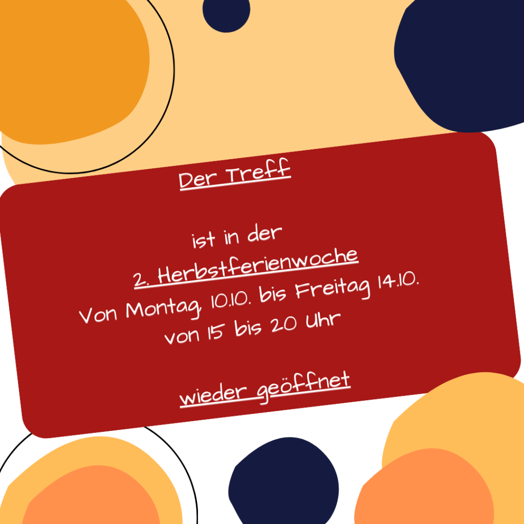In der 1. Herbstferienwoche ist der Treff geschlossen, dafür in der 2. Herbstferienwoche von 15-20 Uhr für euch geöffnet.