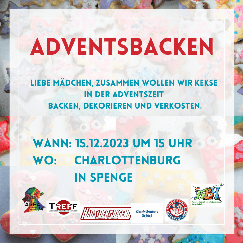 Wir wollen zum Adventsbacken in das Jugendzentrum „Charlottenburg“ Spenge fahren. Riechst du auch schon den leckeren Geruch von gebackenen Keksen und denkst dabei an den Winter, wie du die Kekse verzierst? Dann sei dabei 🙂 Der Ausflug findet am Freitag, den 15.12. statt. Wir treffen uns um 14:30 Uhr am Treff und fahren gemeinsam. Die Teilnahme ist kostenlos.