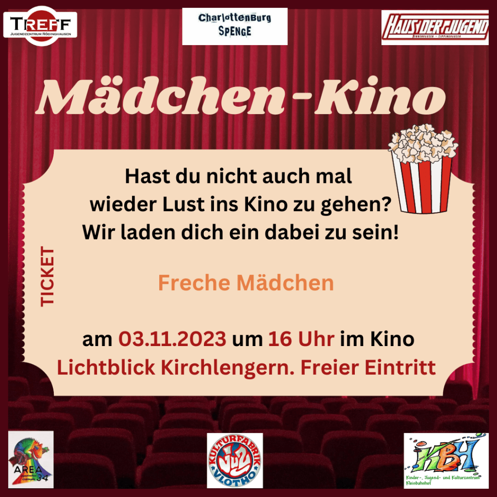 An alle Mädchen, morgen (Freitag, 3.11.) wollen wir um 16 Uhr im Kino Lichtblick in Kirchlengern sein. Dort wollen wir den Film „Freche Mädchen“ schauen und wer möchte kann danach mitkommen in das Jugendzentrum „Area 34“ bis ca 19 Uhr. Die Teilnahme ist kostenlos.