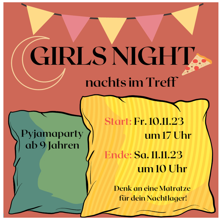 Am Freitag den 10.11.23 um 17 Uhr fängt die Girls night im Treff an. Möchtest du wissen wie es sich im Treff schläft, zusammen Pizza essen und reden bis in die Nacht? Dann sei dabei 🙂 Nachts im Treff mit Marilena und Anneke. Für die Verpflegung ist gesorgt. Am 11.11. gibts ein Frühstück und um 10 Uhr ist die Girls night zuende. Bitte denk an eine Matratze für dein Nachtlager. Die Teilnahme ist kostenlos.